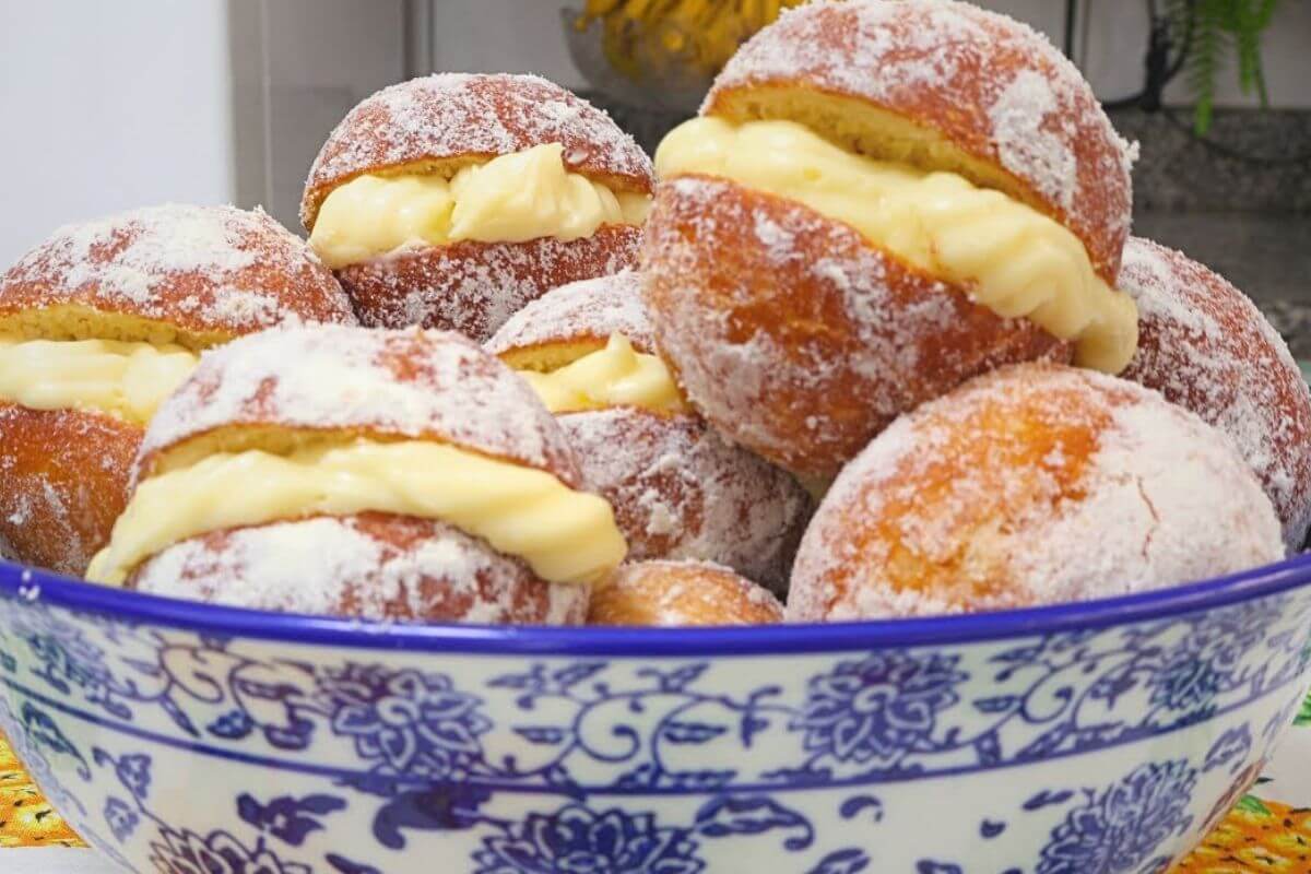 - Para rechear o sonho, corte-o ao meio, sem desemendar, adicione o creme de confeiteiro com um saco de confeitar, e feche o sonho. Faça isso com todos eles.