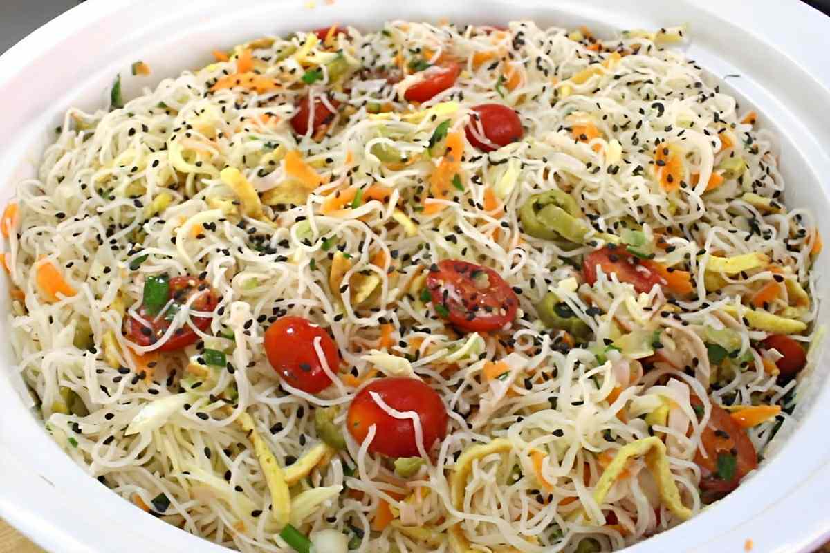 - Prepare o bifum: ferva 2 litros de água numa panela grande, desligue o fogo e adicione sal a gosto na água. Fora do fogo, acrescente o bifum nessa água quente, mexendo delicadamente com um garfo para soltar os fios. Deixe-o de molho na água, até ficar macio, mas firme. Escorra-o num escorredor de macarrão, e lave-o em água fria corrente para interromper o cozimento. Esprema o bifum com as mãos, para retirar o excesso de água, despeje água bem gelada com cubos de gelo por cima, escorra novamente e transfira para a travessa da salada, misturando suavemente com os demais ingredientes.