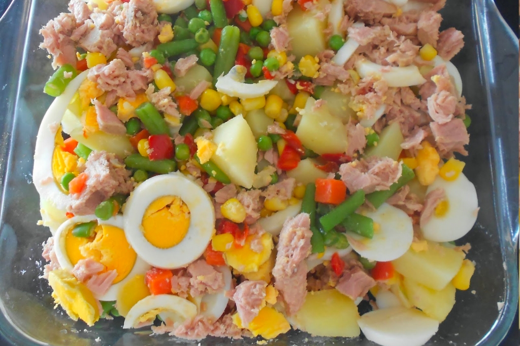 - Cozinhe todos os legumes em água e sal e os ovos. Retire-os, junte o atum e sirva os ovos em rodelas. Tempere com azeite ou com maionese.