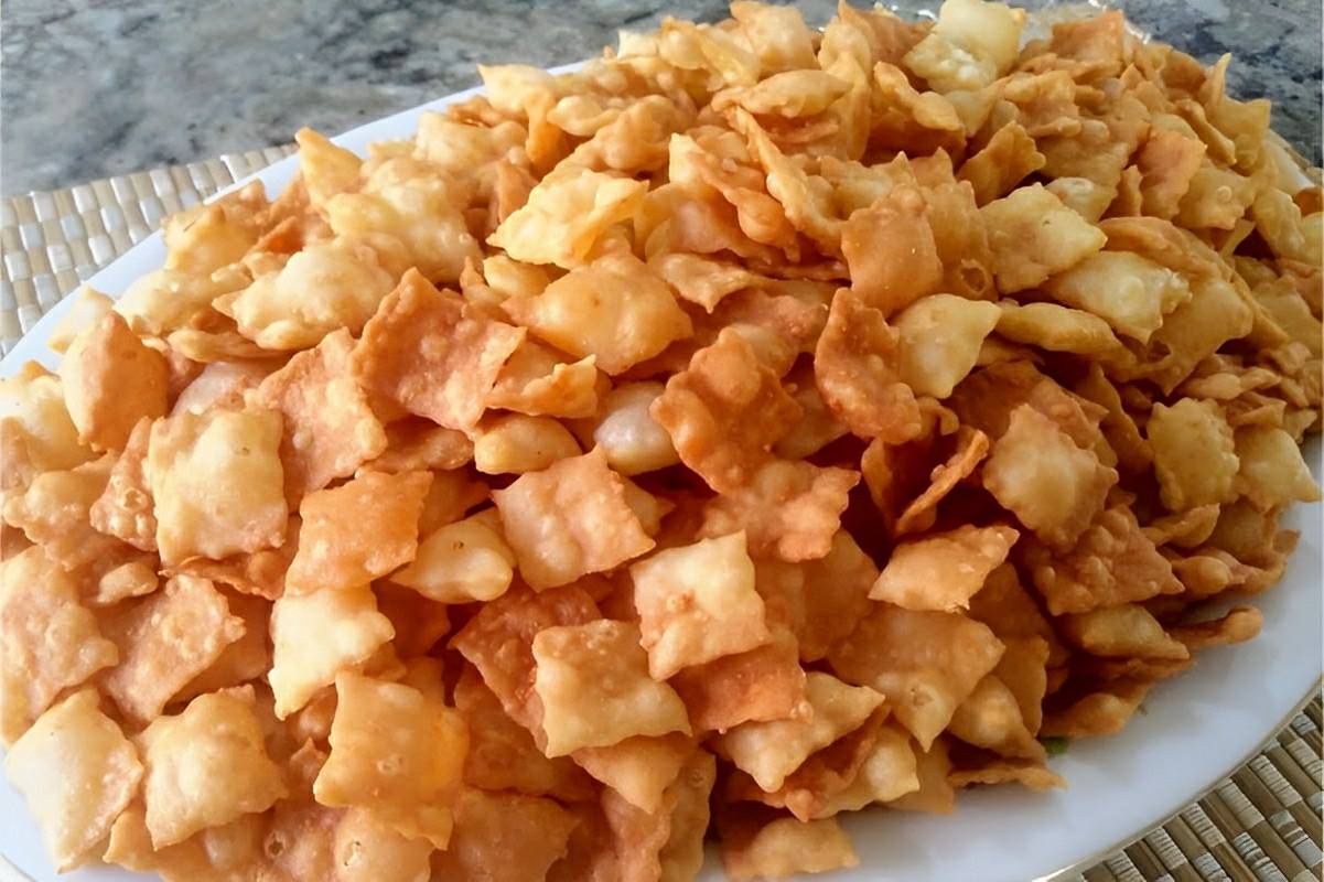 - Faça isso com todo o restante da massa. Frite porções dos quadradinhos de massa em óleo bem quente, até dourar, retire e remova o excesso de óleo em papel toalha.