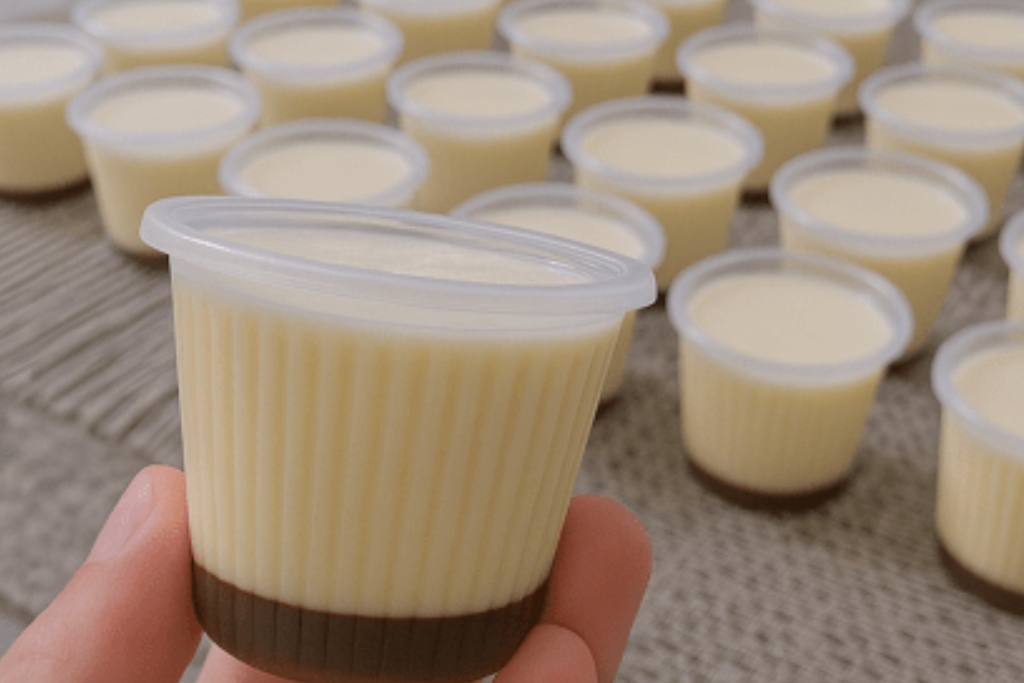 - Coloque uma pequena porção da calda no fundo de cada copinho e, em seguida, adicione o pudim batido.