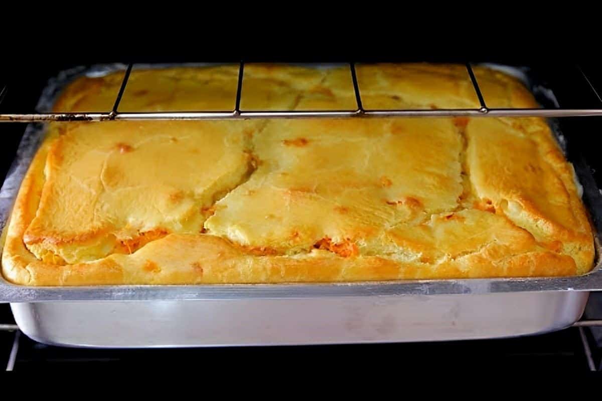- Despeje metade da massa em uma forma untada e enfarinhada.
